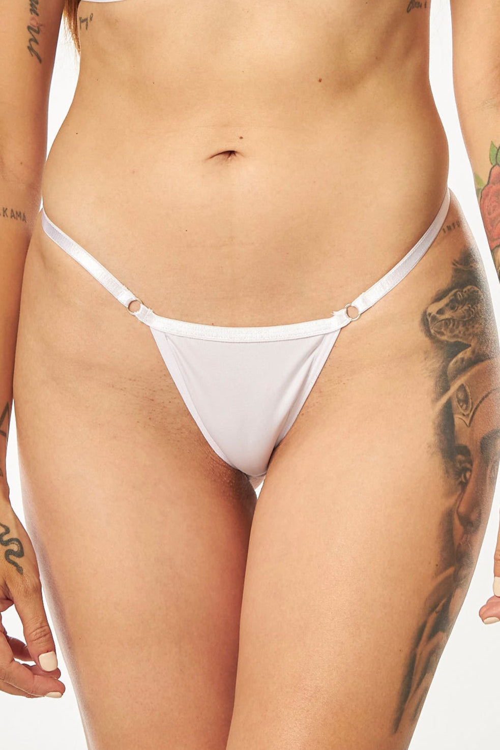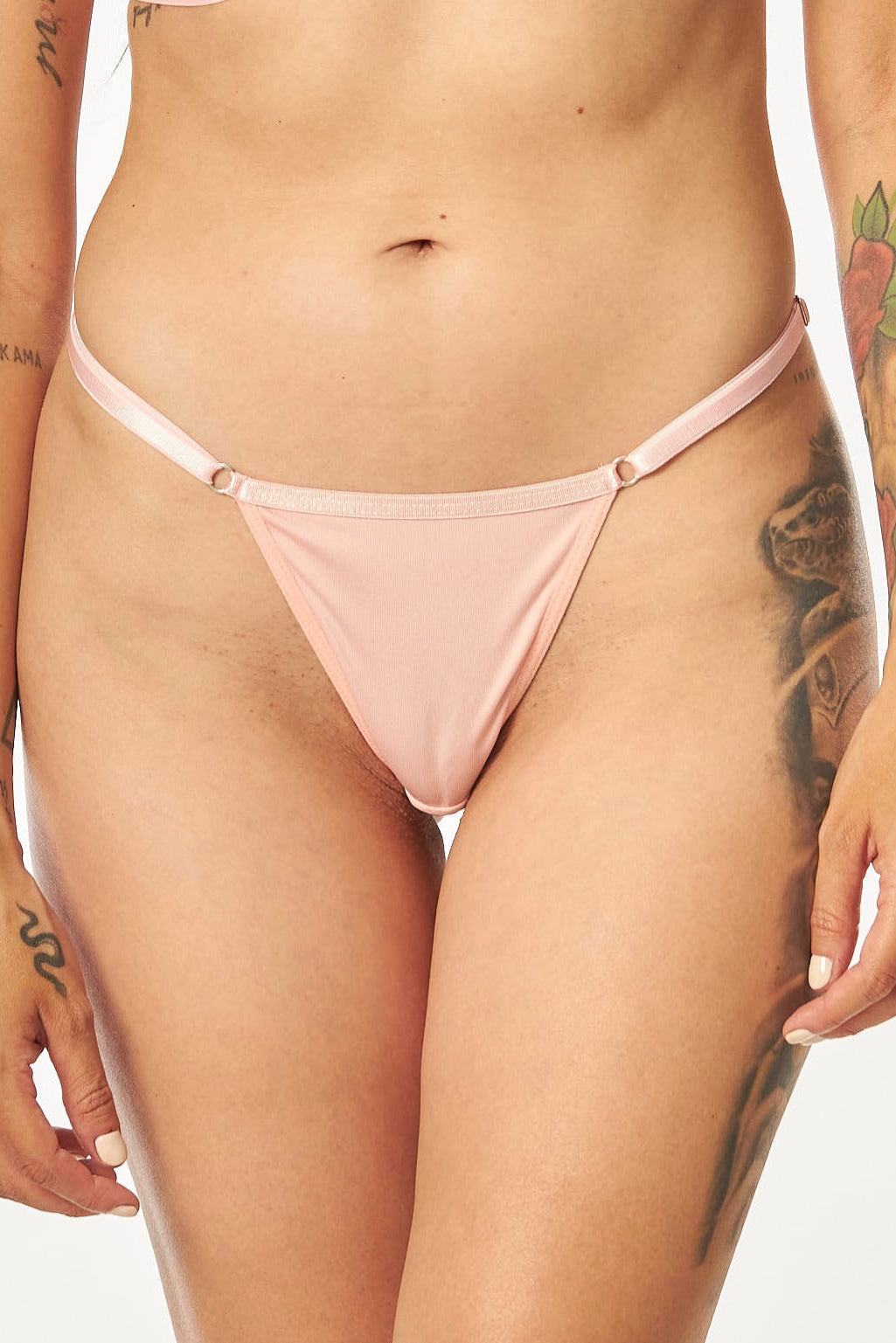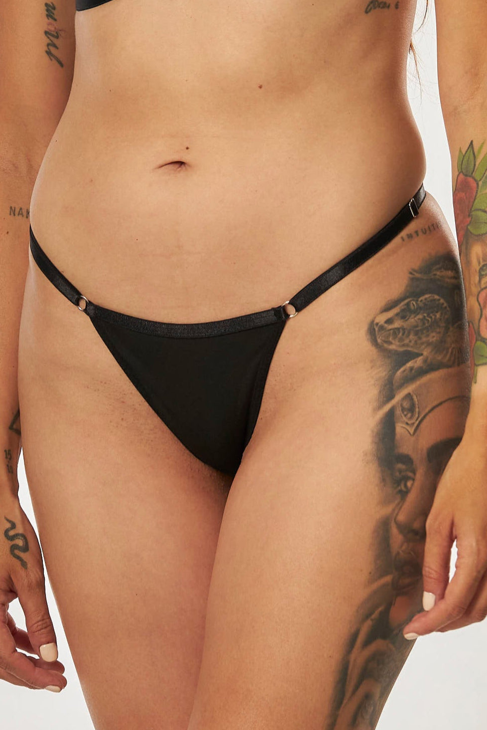 Panty estilo tanga, elaborado en polilicra, con tiras laterales delgadas que se ajustan en las caderas y con un refuerzo en algodón.