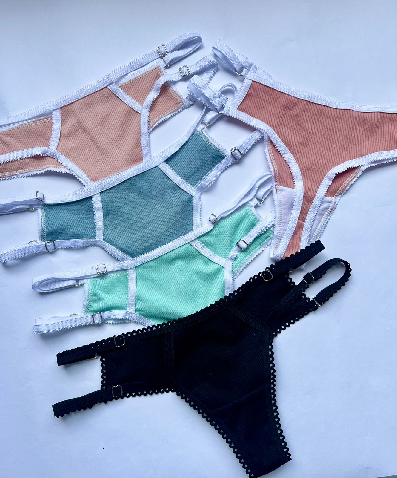 Panty elaborada en tela rib tipo tanga con ajuste en los laterales, tirantes elaborados en elástico decorativo, refuerzo en algodón.